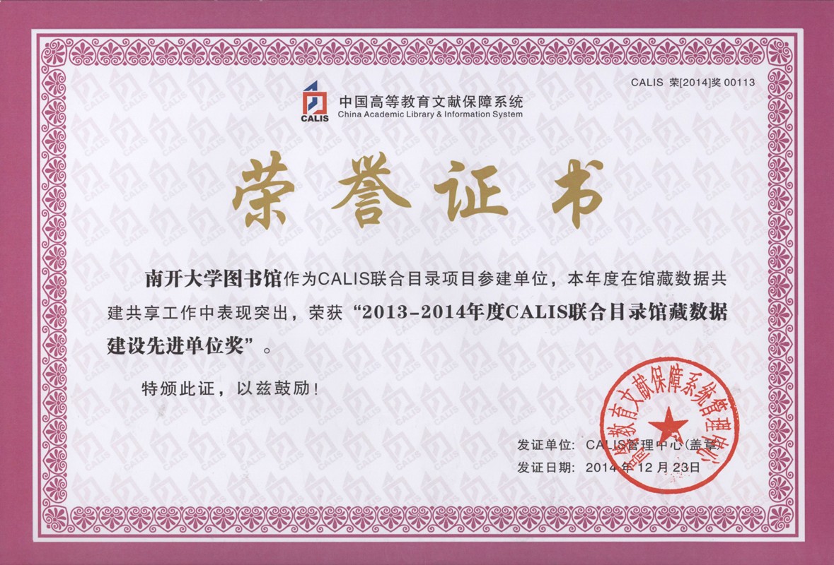CALIS联机合作编目中心组织专家对2013——2014年度CALIS联合目录各项工作指标进行了统计授予该奖项,以表彰我校图书馆极大促进了联机合作编目共建共享工作的开展。