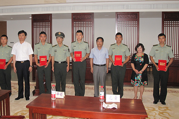 会上,我校图书馆负责人向参加此次古籍特藏文献搬迁保障工作的国防生代表颁发了表彰证书,与汪命锁共同为古籍阅览室揭牌,并向中国人民解放军驻南开大学天津大学选培办敬赠了锦旗。