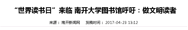 南开大学图书馆向全校师生发出文明读书倡议:仪表整洁,尊重他人;轻声细语,彬彬有礼;适量取阅,爱护资源;勿带饮食,洁净书桌;一人一位,切莫占座;用毕桌椅,轻归原处;健康上网,珍惜时光。
