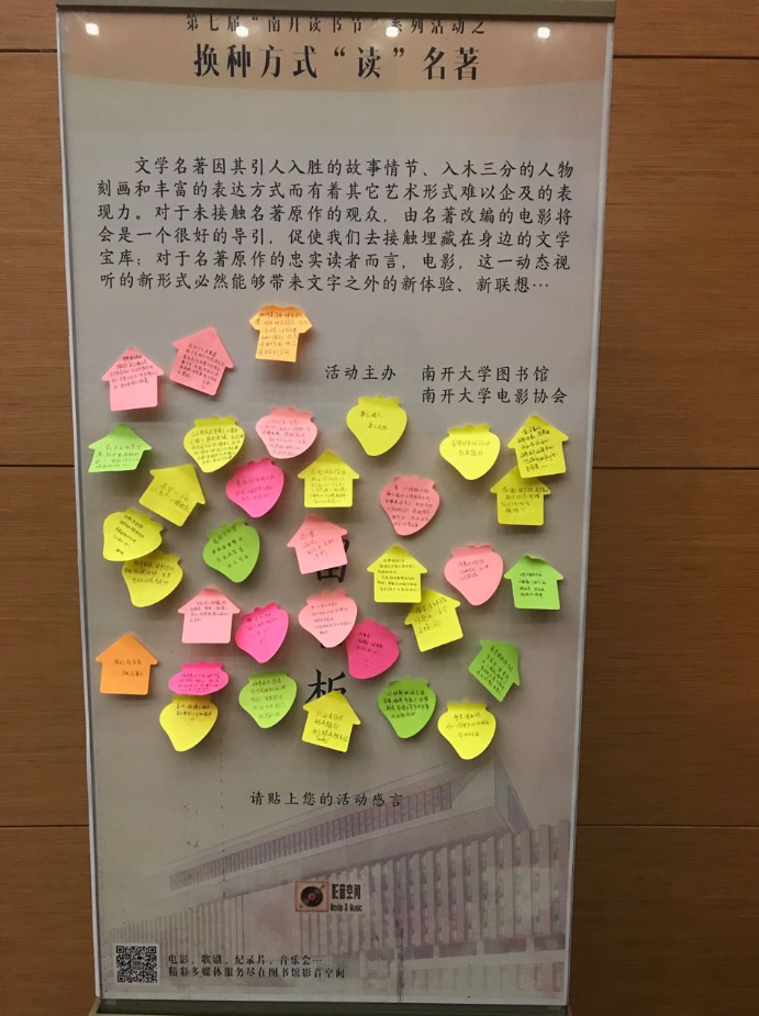 第七届“南开读书节”期间,南开大学图书馆携手电影协会共同举办了“换种方式‘读’名著——读名著、赏电影、享心得”主题读书活动。图书馆分别于2017年4月22日、27日为读者播放中外经典名著改编的电影《骆驼祥子》、《傲慢与偏见》,并组织读者进行观影心得分享会。