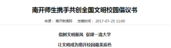 南开品格、中国特色、世界一流的大学一定是精神文明的制高点。在此,我们向全体南开师生发出倡议: