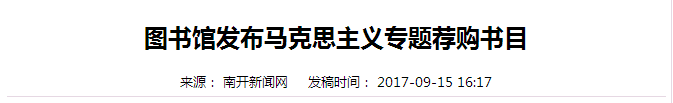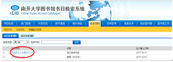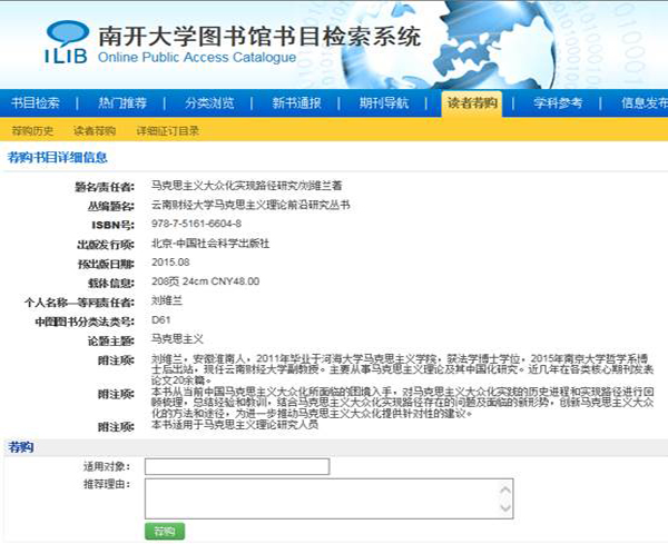 南开新闻网讯(通讯员 李力文)为贯彻落实全国高校思政工作会议精神,配合我校马克思主义学科建设,近日,我校图书馆搜集人民出版社、中央文献出版社、中共党史出版社、中共中央党校出版社等马克思主义哲学重点出版社近年来出版的图书目录,于近期整理并发布了首期“马克思主义专题书目”。读者通过登录“图书馆主页——馆藏目录——读者荐购——详细征订目录”,可以点开每种图书,查看具体信息,并根据个人需求点击“荐购”,图书馆采访人员将在5个工作日内进行处理并回复,该书即可进入图书采购流程。图书上架后,荐购人将享有优先借阅权,从而满足读者在马克思主义学科方面的教学、科研需求。