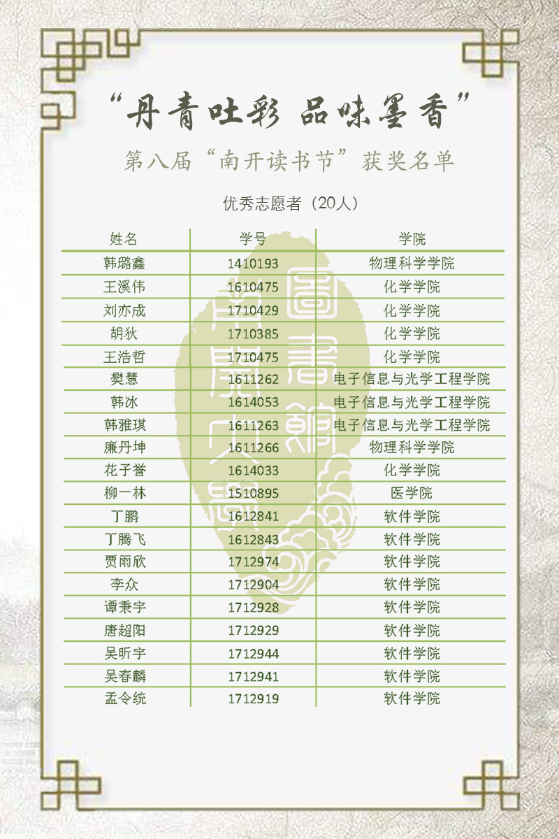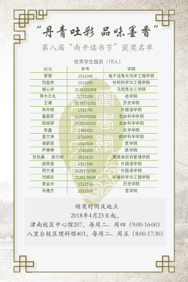 第八届 “南开读书节” 获奖名单——优秀志愿者、优秀学生馆员