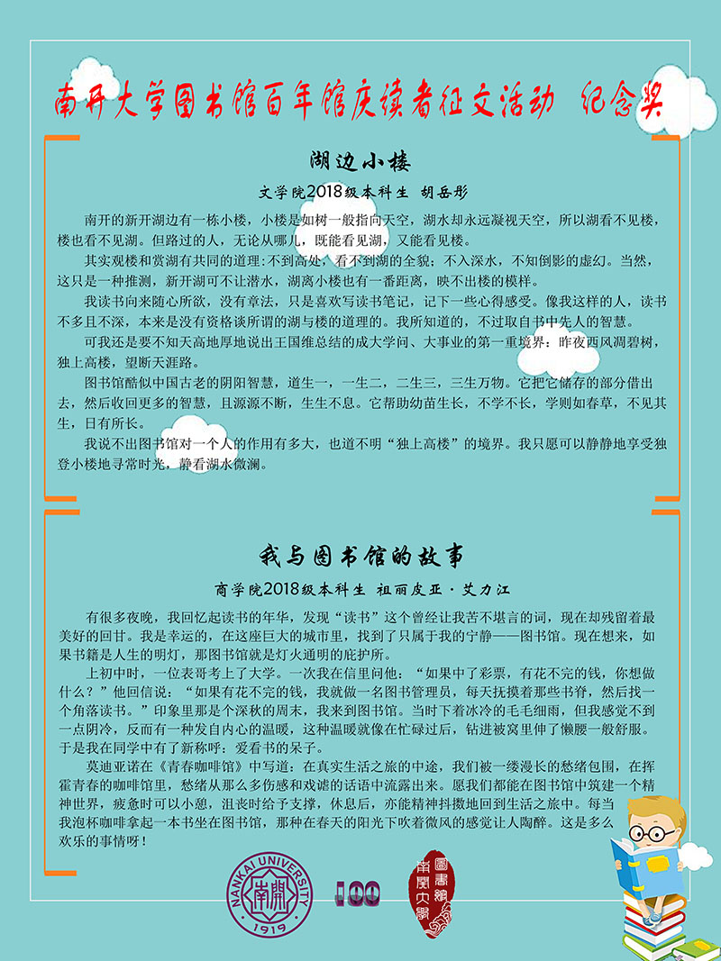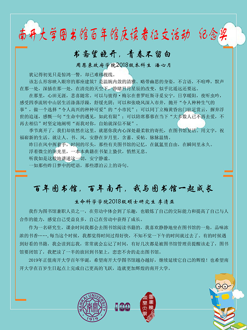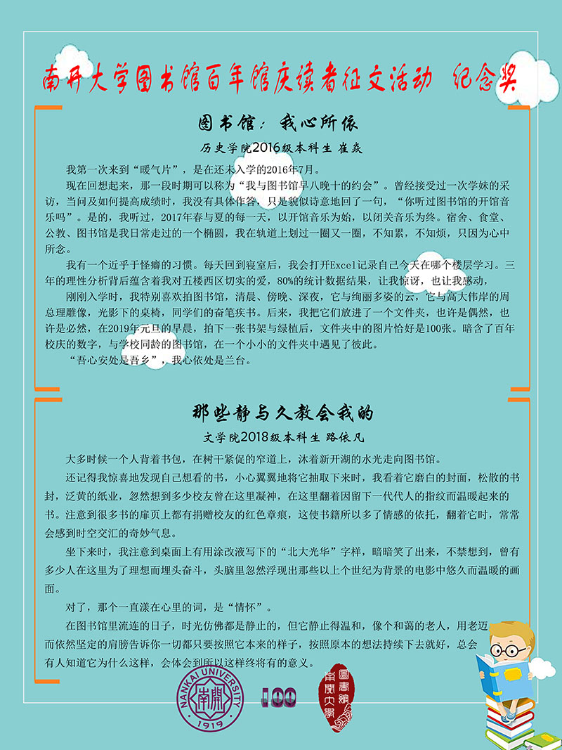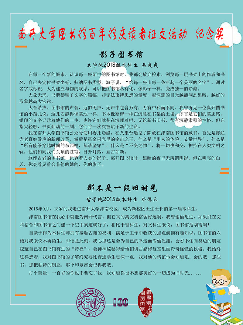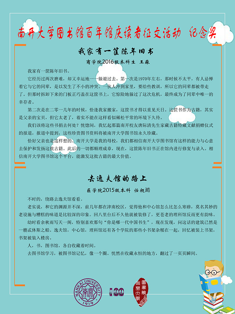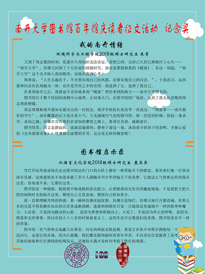 南开大学图书馆百年馆庆读者征文活动受到广大读者的积极响应。读者用一篇篇文章,一句句话语,讲述了自己与图书馆的故事,描述了图书馆对其学业的帮助作用,抒发了对读书的热爱和对图书馆的感情,表达了对南开百年、图书馆百年的祝福,文章内容真实、情感真挚。