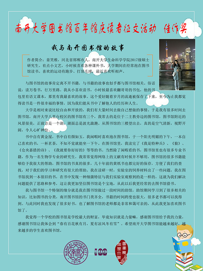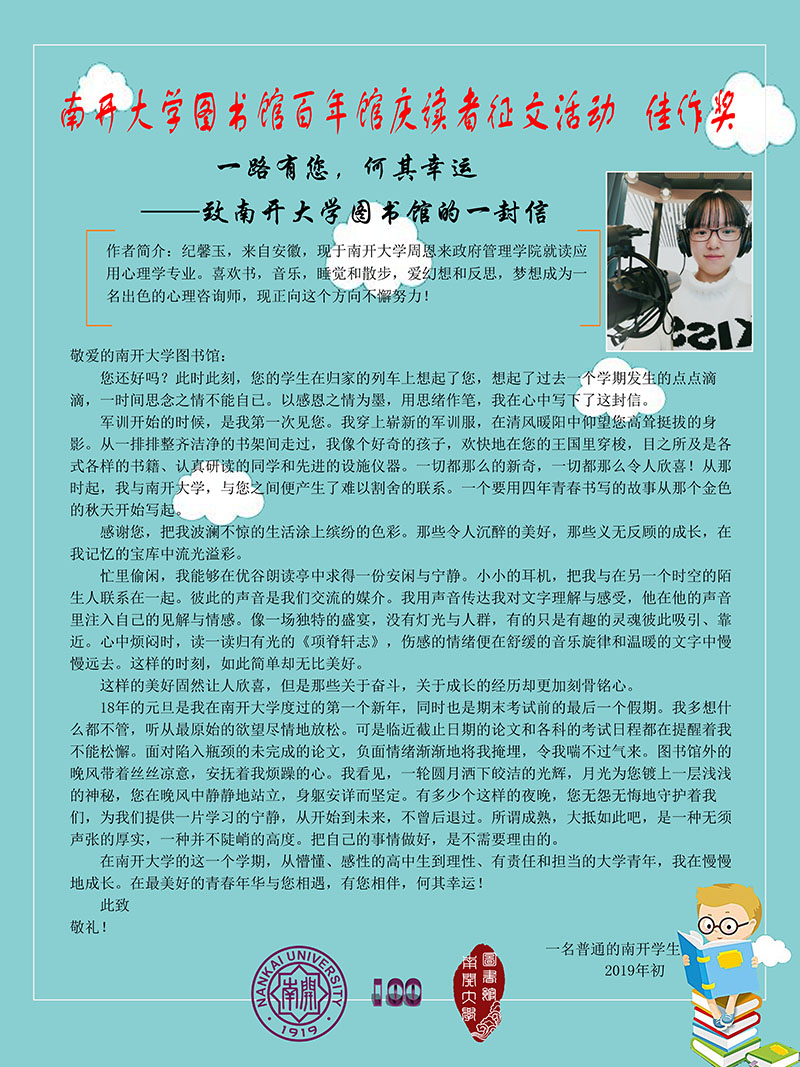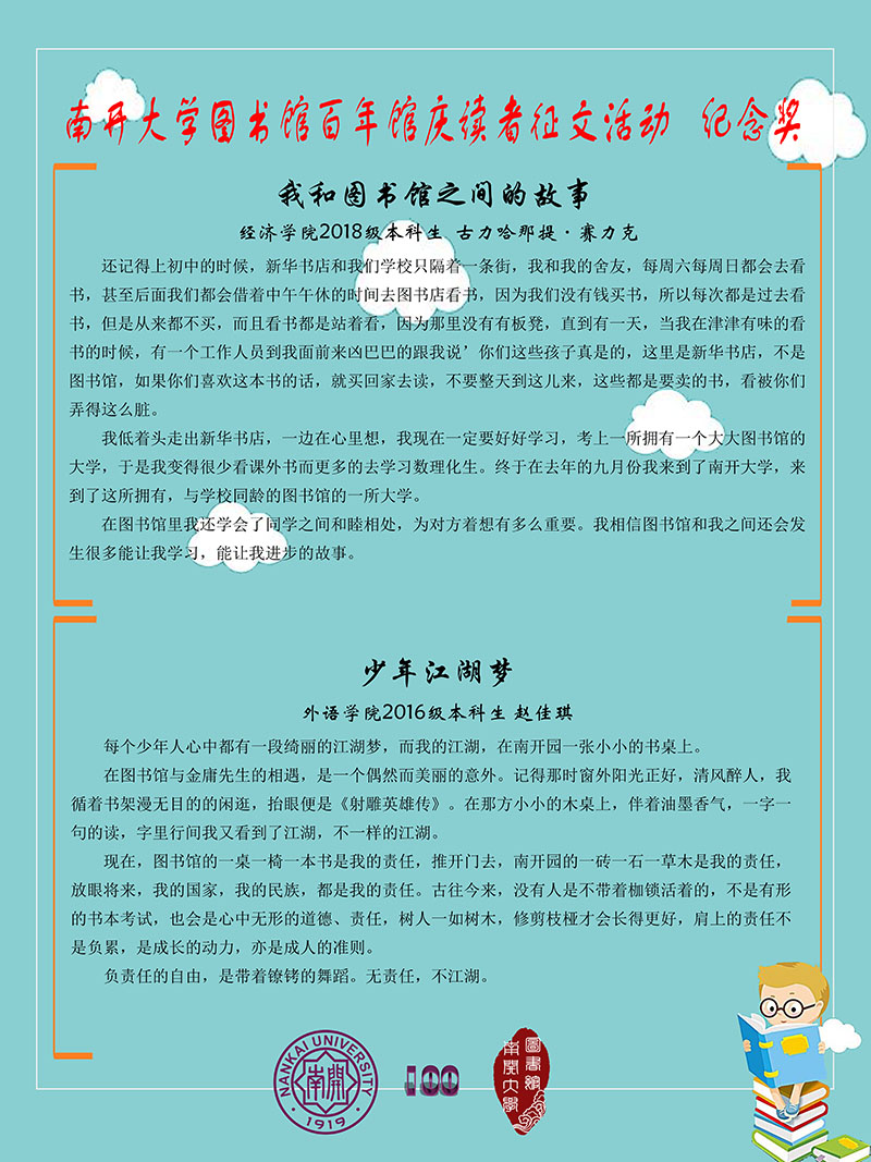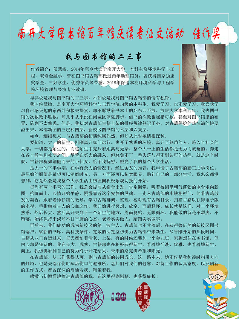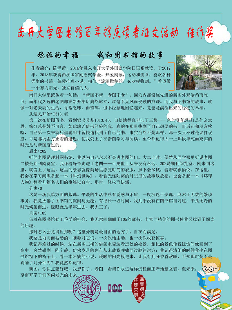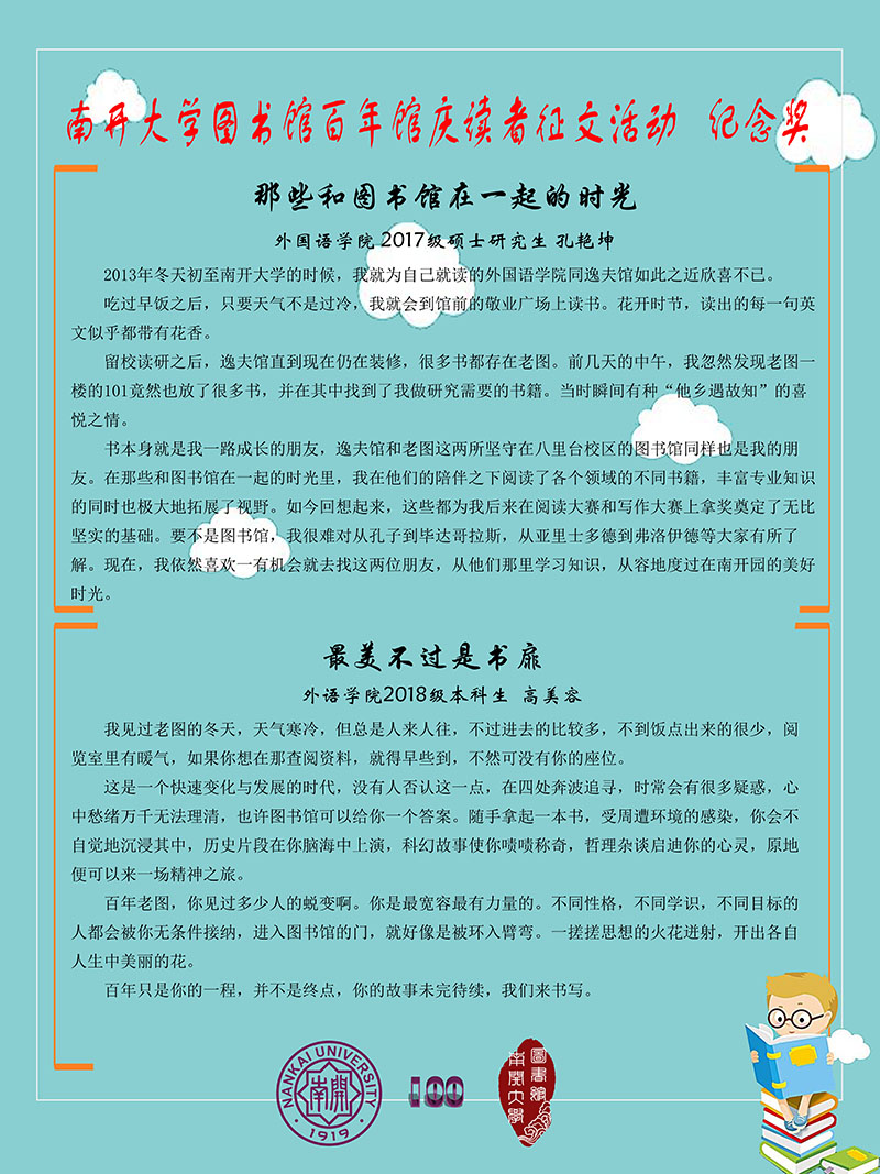 南开大学图书馆百年馆庆读者征文活动受到广大读者的积极响应。读者用一篇篇文章,一句句话语,讲述了自己与图书馆的故事,描述了图书馆对其学业的帮助作用,抒发了对读书的热爱和对图书馆的感情,表达了对南开百年、图书馆百年的祝福,文章内容真实、情感真挚。