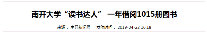 南开新闻网讯(记者乔仁铭)在4月23日“世界读书日”到来之际,南开大学图书馆依照惯例对全校学生一年的借书量进行统计。来自数学科学学院的本科生徐襟在2018年借阅图书1015册,以平均每天约2.78本图书的借阅量,荣登南开大学“读书达人”榜单榜首,成为了南开园里的“读书明星”。