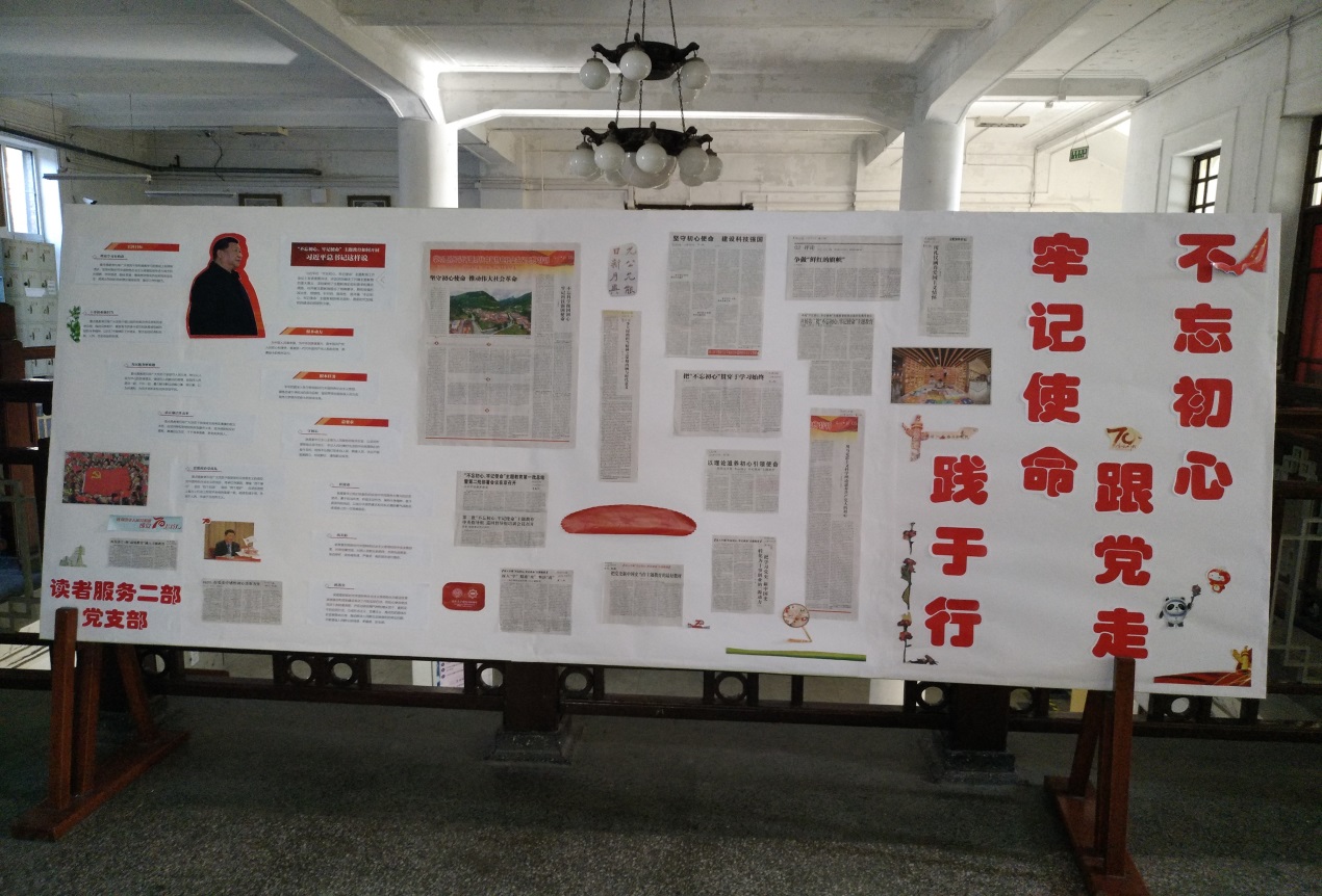 在二楼的展板区,制作了以“不忘初心跟党走,牢记使命践于行”为主题的展板,展板资料是基于馆藏电子和报刊资料的搜集和整理,展板内容以习近平总书记关于“不忘初心、牢记使命”主题教育重要讲话精神的解读和《人民日报》、《光明日报》等党报党刊关于“不忘初心、牢记使命”主题教育的理论内容刊载为主?!爸Р可睢鼻哉掌问?,展示了读者服务二部支部本年度支部理论学习和党日活动情况。
