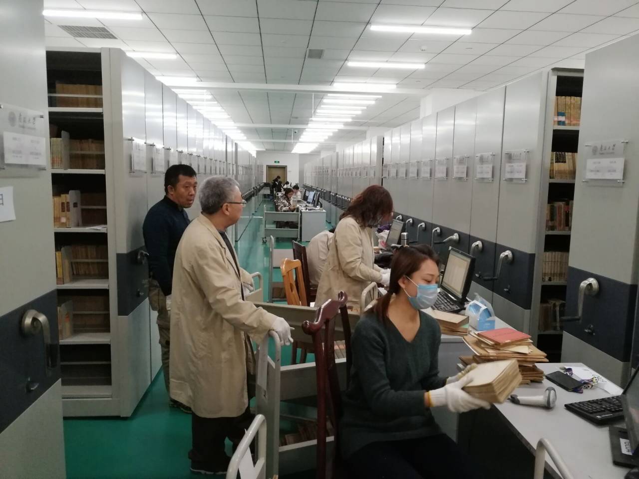 在盘点工作中,负责扫码的馆员们一站就是一天,翻书扫码一刻不停,还要时刻关注是否存在数据有问题的图书,每人每天要完成近2000册的盘点量。负责图书上架下架的馆员和学生助管们,更是在没有暖风的密集书库中干的汗流浃背。由于书库中所藏的图书出版年代较早,往往比较破旧,灰尘较多,一天工作下来,馆员们都是灰头土脸,腰酸背痛,但是没有人有一句怨言。