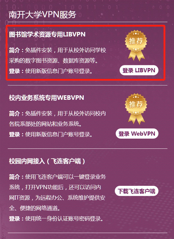 若通过南开大学VPN服务https://www.nankai.edu.cn/VPN/list.htm进入,请选择页面最上面的“登录LIBVPN”入口。