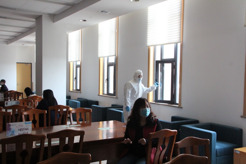 在中心馆三楼东侧阅览区,由馆员模拟读者按照桌面指示标识入座,巡查员例行现场巡查,发现座位不规范者及时纠正。在阅览区,由馆员扮演连续咳嗽的读者,经巡查员发现后立即启动应急预案。巡查员紧急电话通知图书馆后勤保障部,并安抚周围读者原位不动,将咳嗽异常的读者从楼梯引导至临时隔离点进一步观察检测,接下来物业人员对所在区域进行通风、消毒,随后由后勤保障部按照程序向学校报备情况。