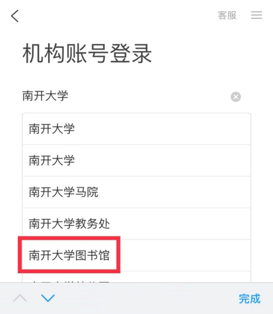 (三)在机构账号登录页面“学校/单位/fid机构代码”一栏输入“南开大学”,在下拉选项中选择“南开大学图书馆”,并填写学号和密码进行登录。(初始密码为身份证后六位)