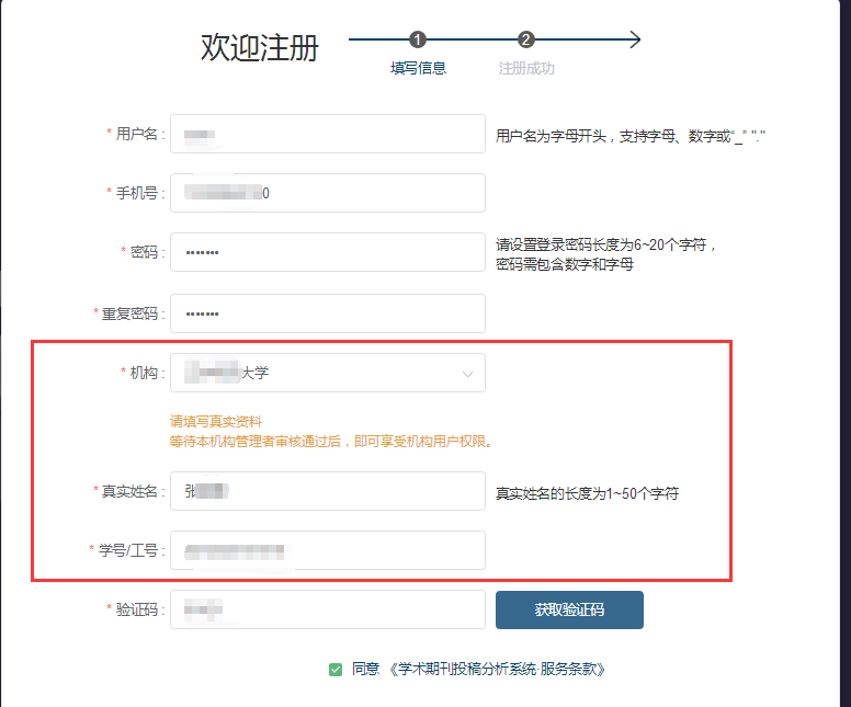 本校用户注册时,在机构处搜索并选择我校机构(也可在个人中心-申请认证),并填写真实姓名和学号或工号,图书馆会审核并通过。认证后的本校作者将获得机构使用权限。
