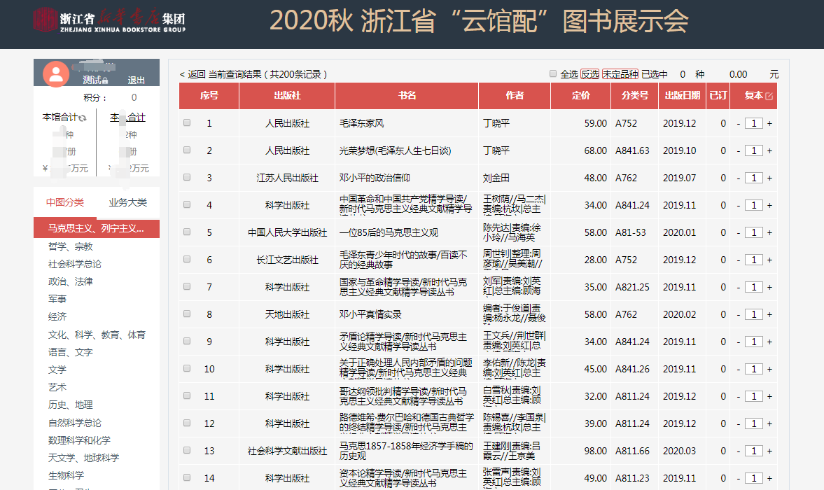 b.读者可在选购页面:进行订购、检索等操作,系统可按图书的综合评分、出版时间、定价排序。也可按价格区间、出版时间段、重点图书进行模糊/精准筛选。