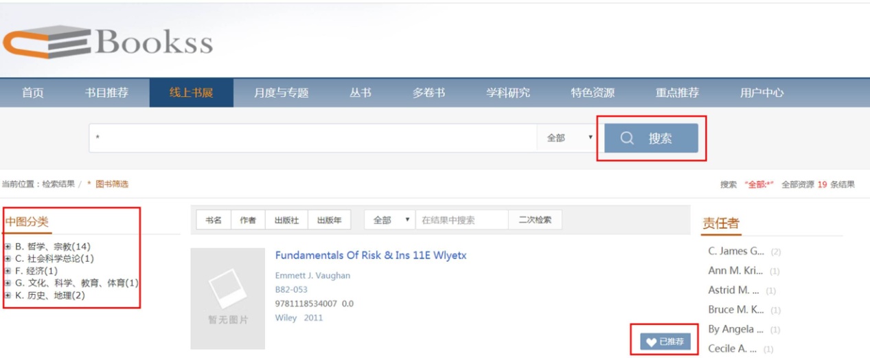 读者可在“线上书展”栏目对书目进行浏览及检索,可根据作者、出版社、出版年等关键词进行检索,也可以直接使用中图分类法分类来浏览选择自己需要的图书。左侧为中图分类选择,右侧为作者、出版社等筛选项。找到需要的图书后,点击推荐按钮进行推荐。荐购成功显示“已推荐”。
