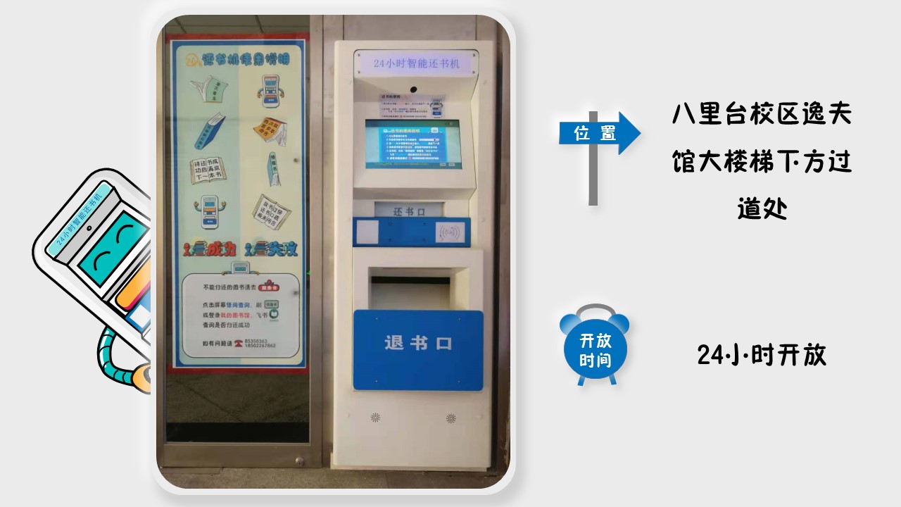 方便读者还书,现图书馆决定于12月7日星期一起开放1台24小时自助还书机,位于八里台校区逸夫馆大楼梯下方一层过道处。