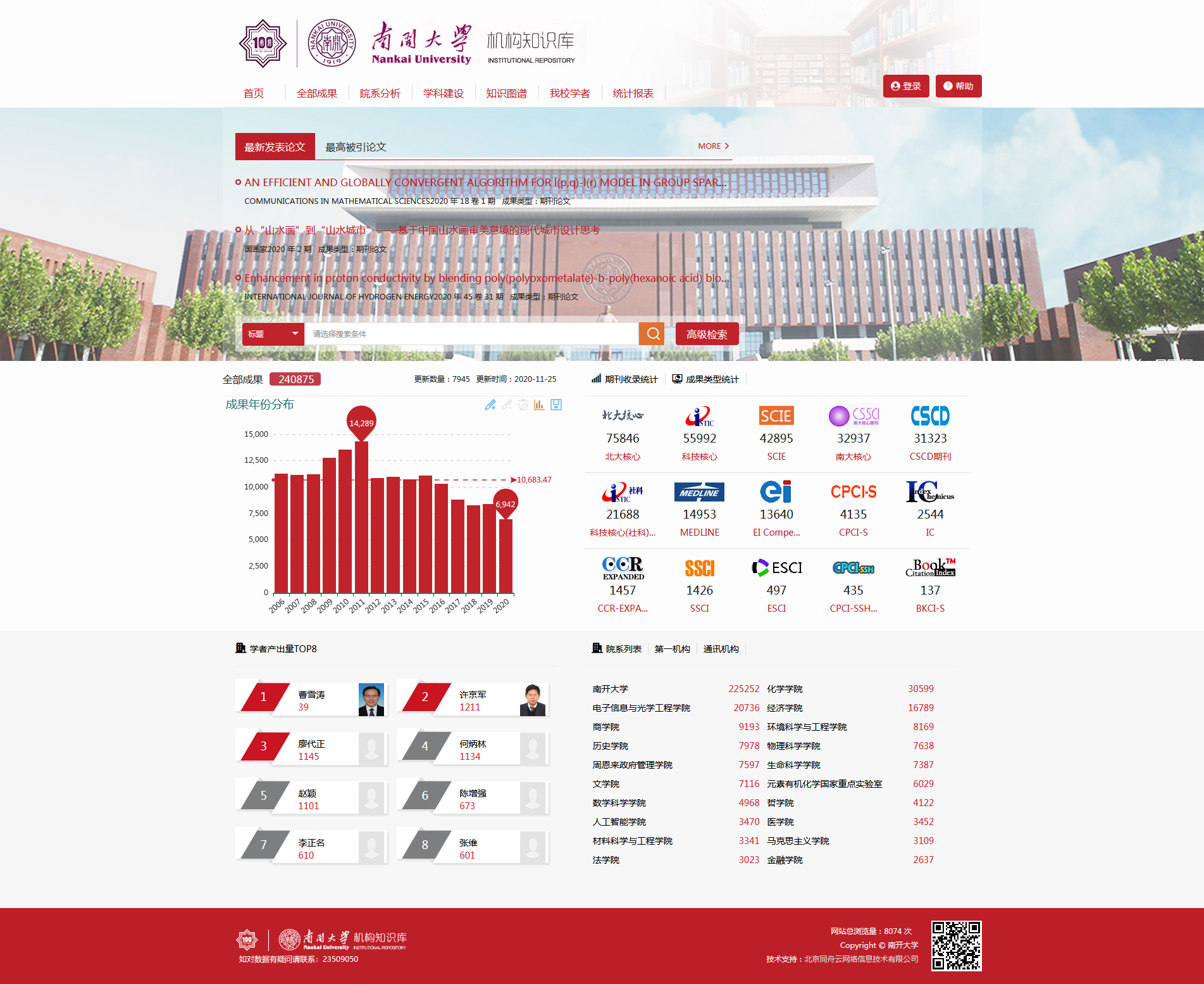经图书馆与北京同舟云网络信息技术有限公司的共同努力,“南开大学机构知识库”即日起正式上线试运行,为教学科研、学科建设以及学校发展提供必要的服务支持。