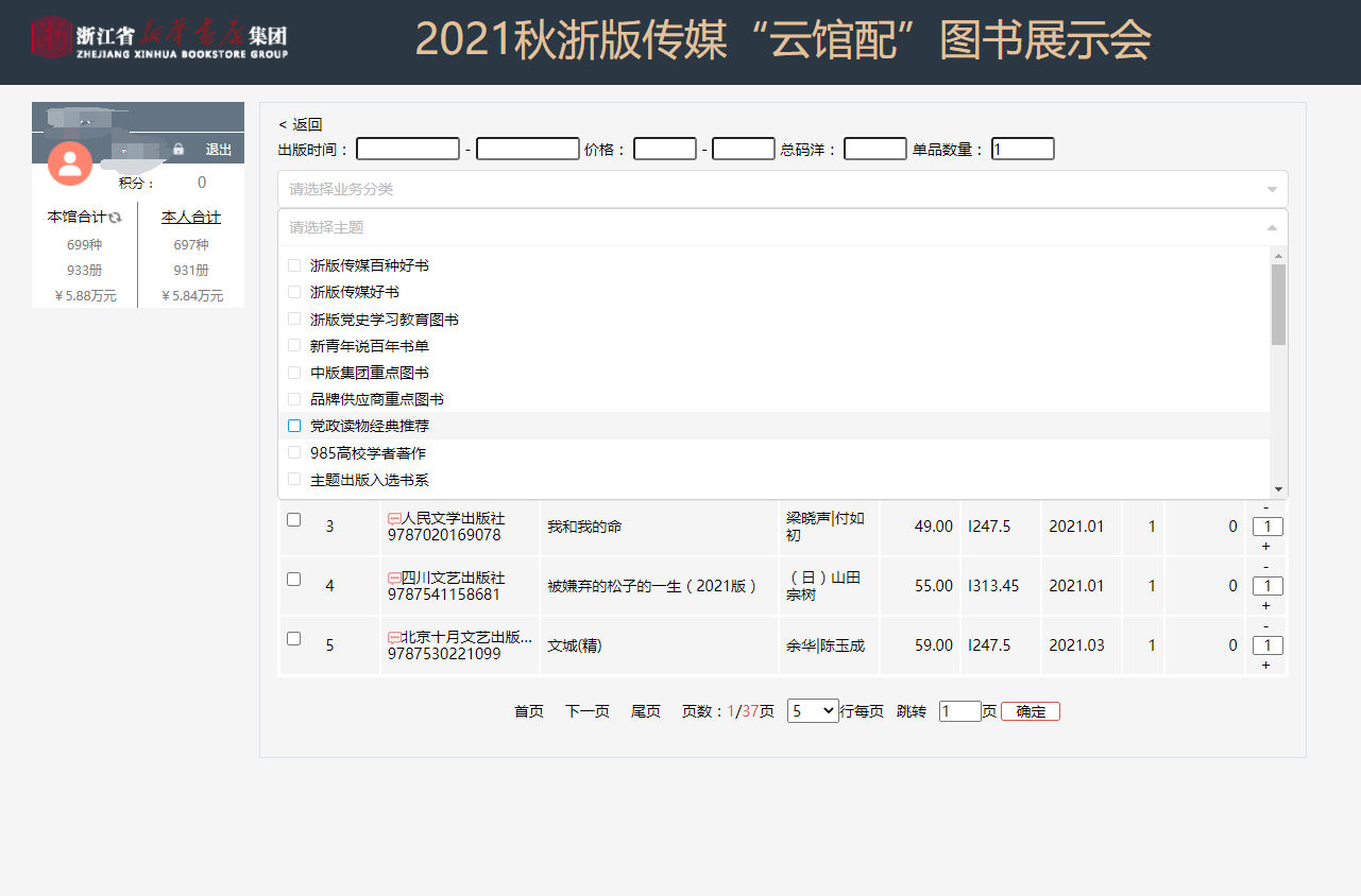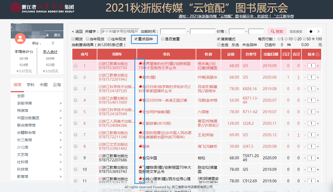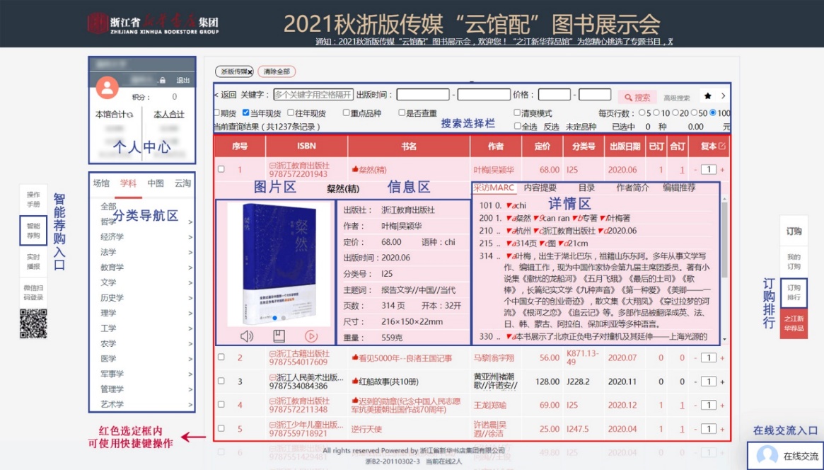 b.读者可在选购页面:进行订购、检索等操作,系统可按图书的综合评分、出版时间、定价排序。也可按价格区间、出版时间段、重点图书进行模糊/精准筛选。
