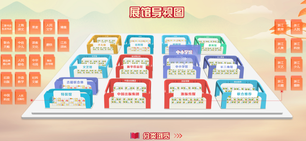 c.特设浙江出版集团、中国出版集团、长三角联合馆、联合推荐馆、之江新华荐品馆及五大类馆区,并用图标