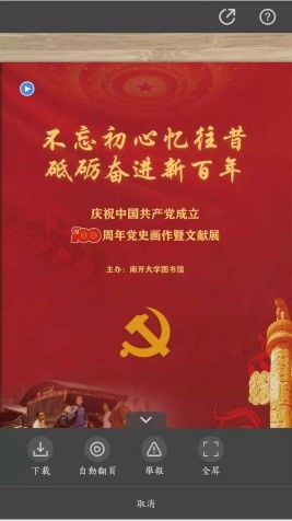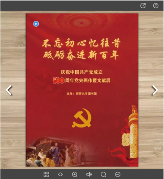 为加大展览教育辐射力度,持续扩大展览覆盖面,强化影响力和传播力,让更多观众随时随地便捷地参观体验展览,南开大学图书馆制作了数字化网上展览。借助网络平台,全要素呈现展览内容,打造足不出户、永不落幕的主题展览。网上展览以新媒体平台为依托,生动再现“庆祝中国共产党成立100周年党史画作暨文献展”全貌。网上展览内容包括88组图文展板、1个展览现场介绍视频、88个配乐解说音频,囊括了展览全要素。观众可以通过电脑或手机访问网上展馆,自主体验参观,详细了解展览内容信息,欣赏反映中国共产党成立100年来各个时期重要历史事件的100幅经典画作,观看展区现场介绍视频,点播画作及党史解说音频。展览支持查看缩略图、页面缩放、自主或自动翻页、搜索页面、全屏和下载等功能,并可一键分享到微博、微信等多个平台,使更多人了解中国共产党百年走过的辉煌历程。