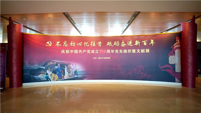 “不忘初心忆往昔,砥砺奋进新百年——庆祝中国共产党成立100周年党史画作暨文献展”于今年全年展出,以一百幅经典画作、数百部图书影像和包括馆藏记载开国大典等党史重要事件的《人民日报》在内的多份珍贵文献,展现党的百年辉煌历程,旨在以生动画面、艺术语言和详实史料,讲述中国共产党团结带领全党全国各族人民矢志不渝、砥砺前行的光辉历史,讴歌一代又一代中国共产党人顽强拼搏、忘我奉献的精神伟力,引导全校师生学党史、悟思想,传承红色基因,厚植爱党爱国情怀。同时专设“与党同行”板块,搜集整理呈现了同一时期中,诞生于五四运动时代大潮中的南开大学在中国共产党的坚强领导下,始终与党和国家民族休戚与共,为党育人、为国育才的奋进史实,激发南开师生将爱党爱国、奋发有为的精神力量转化为践行初心使命,努力学习工作,为党和国家奉献青春力量的强大动力。