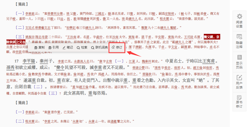 为了在保留原书面貌的同时,吸纳读者的建议,2021年9月“中华经典古籍库”上线了原书修订功能, 用户在使用原书修订功能的过程中,针对图书中存有疑义的内容,可以通过“修订”的方式进行意见反馈,推送至“中华经典古籍库”的后台,管理人员会将相关修订意见提交给专家进行审核。