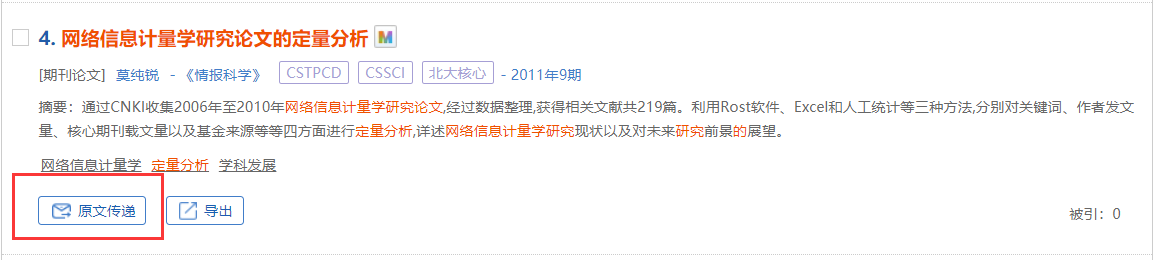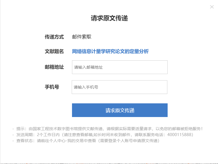 万方期刊及学位论文数据库增强版资源的获取方式包括在线阅读、全文下载、原文传递。其中原文传递只需填写接收传递文献的邮箱地址和本人手机号,即可申请原文传递。