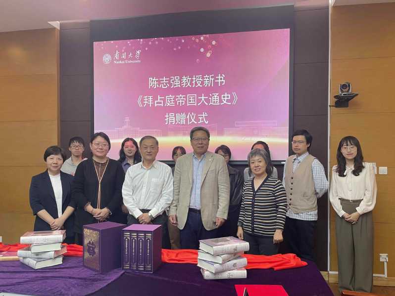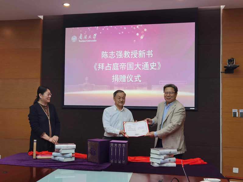 10月18日,南开大学历史学院教授陈志强在津南校区向南开大学图书馆捐赠新书《拜占庭帝国大通史》。图书馆馆长韩召颖接收捐赠,并向陈志强致送捐赠证书。图书馆党委书记马亚男,资源建设部负责人出席本次捐赠仪式。