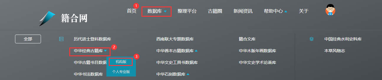 第二步:鼠标移入“数据库”根目录,点击进入《中华经典古籍库》(机构版)。