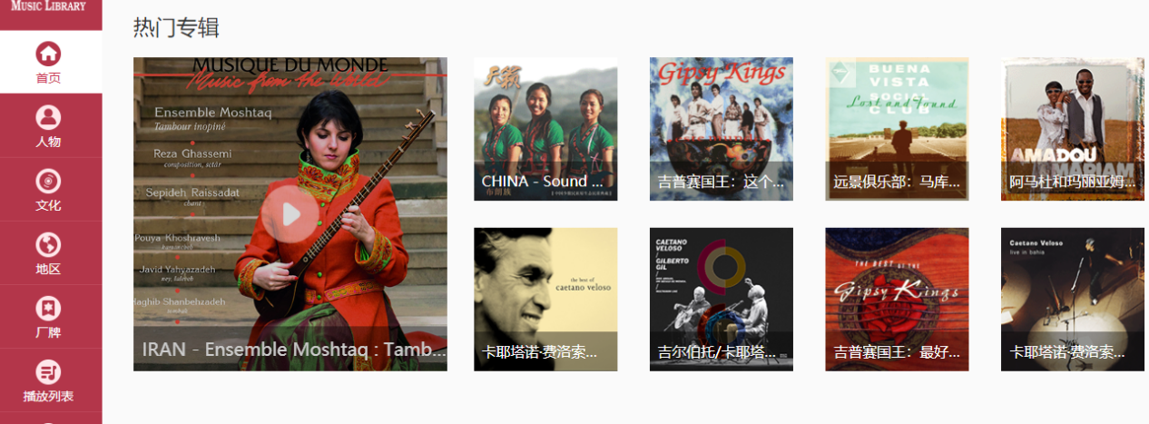 提供种类丰富的世界音乐,包含从传奇历史音乐表演到当代世界音乐的内容,音乐资源来自150多个国家、超过1500个文化群体,共汇聚了32000位艺术家的唱片和近万张专辑(101000首音频),新专辑持续更新。