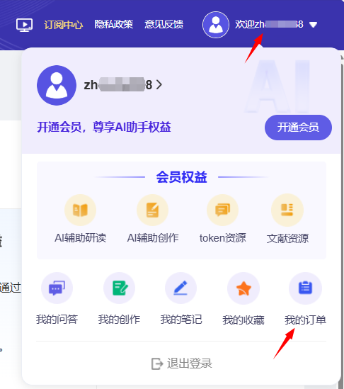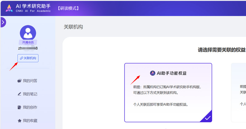 打开https://aiplus.cnki.net登录已注册的知网个人账号,点击右上角账号进入个人中心--我的订单--关联机构,选择AI助手功能权益。