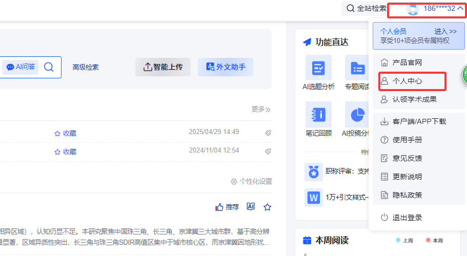 方法二:进入知网首页www.cnki.net,点击右上角登录个人账号、密码(或短信验证码登录),切换至CNKI AI进入即可使用。