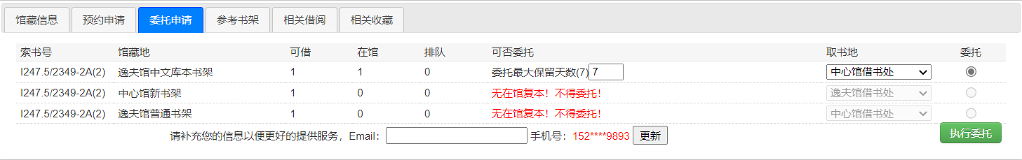 拟借的图书所在校区馆缺藏或已外借,而在另一校区馆仍有复本未借出,读者可登录 “我的图书馆”,通过OPAC检索系统办理委托申请。