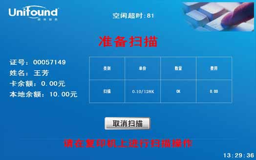 此次刷卡将终止本次扫描任务,并对您本次的扫描任务进行金额结算。(如果您忘记刷卡退出,请不要担心,在机器闲置超过90秒后,系统仍然会终止本次扫描并对您本次的扫描进行金额结算)。 如图五所示: